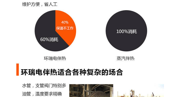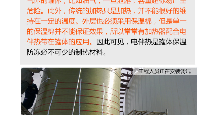 所以,罐體不僅要防凍保溫,仍需要加熱。據(jù)此,可選擇不同的電伴熱種類,予以實(shí)現(xiàn),它不用接觸罐體的介質(zhì),只靠熱量的傳遞,達(dá)到保溫加熱的效果。