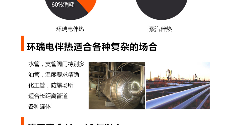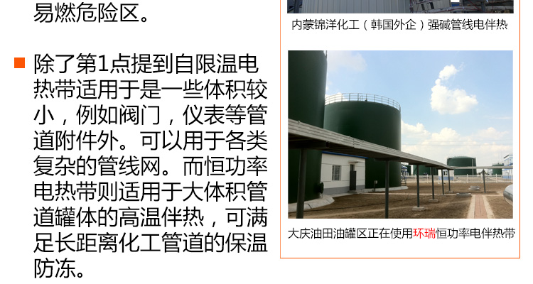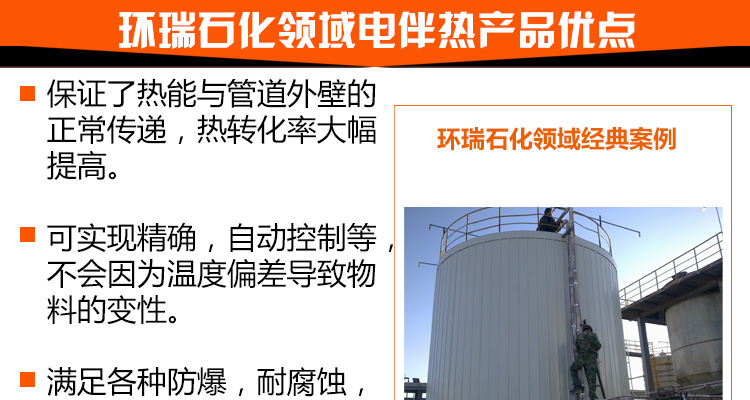 石化場所下的長距離管道,因輸送過程和長時(shí)間的儲(chǔ)存過程中會(huì)因散熱造成溫度下降,溫度的下降會(huì)使粘性物料的粘度升高,而對(duì)易結(jié)晶物料則可能使物料產(chǎn)生結(jié)晶,從而造成料液的輸送發(fā)生困難,嚴(yán)重的會(huì)造成管道系統(tǒng)的堵塞。為避免這種情況發(fā)生,必須對(duì)系統(tǒng)散失的熱量予以及時(shí)補(bǔ)充,即對(duì)系統(tǒng)進(jìn)行連續(xù)不斷地加熱。 |
