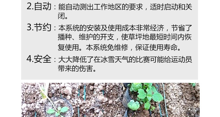 發(fā)熱電纜土壤加熱系統(tǒng)可以防止土壤凍結(jié),草綠長青。維護、維修成本低、安全可靠。適用于運動場、四季廣場、花園草坪的土壤加熱。
