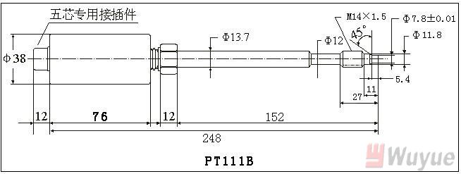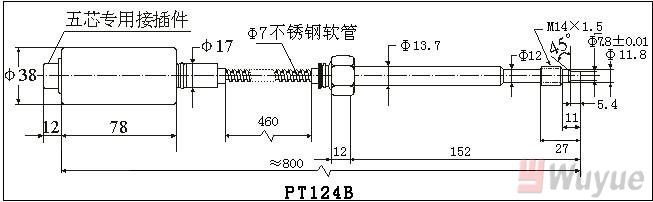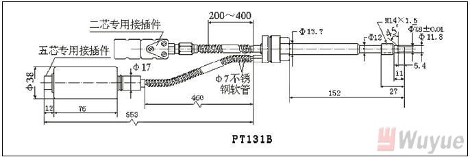 5、選型舉例:PT124B-20MPa-M14-152/460-2/5單功能軟管型變送器20MPa,M14×1.5。直桿長(zhǎng)152mm,軟管長(zhǎng)460mm,五芯接插件,4-20m A輸出。