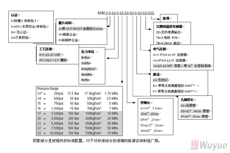 輸出,模擬:4-20mA(標(biāo)準(zhǔn)壓力,溫度可選) 輸出,數(shù)字:HART 綜合精度(錯誤)(20-100%滿量程): ±0.25%滿量程(3M和3M以上) ±0.35%滿量程(1.5M和1.5以下) 溫度漂移(77-572℉,25-300℃): 0.001%滿量程/℉,最大(0.001%滿量程/℃,最大) 重復(fù)性:±0.1%滿量程 爆破額定壓力:2X滿量程 超壓 額定:1.5X滿量程 量程:1,500至10,000psi 可調(diào)范圍:6:1調(diào)節(jié)比,向下 負載電阻:250歐姆@18Vdc;500歐姆@23Vdc |