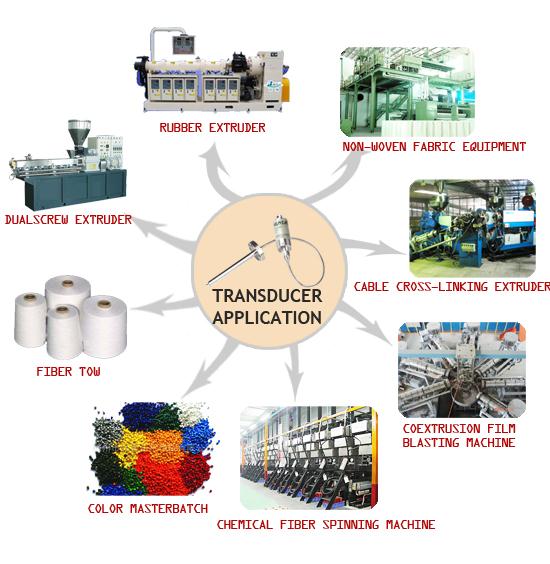 Rubber extruder, plastics extruder, cable extruder, textile machine, moulding plastics machine, melt- pump, non-woven fabric machine. Our environmental melt pressure sensor and transmitter are also applied in food machine and water process water treatment industry.