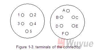 The terminals of connector are as follows: (numeric symbol for five pin cable, alphabetic symbol for six pin cable)